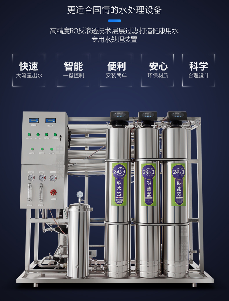 采用多次過(guò)濾層的過(guò)濾器,主要目的是去除原水中含有的泥沙、鐵銹、膠體物質(zhì)、懸浮物等顆粒在20um以上的物質(zhì),可選用手動(dòng)閥門(mén)控制或者全自動(dòng)控制器進(jìn)行反沖洗、正沖洗等一系列操作。保證設(shè)備的產(chǎn)水質(zhì)量,延長(zhǎng)設(shè)備的使用壽命。